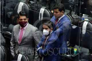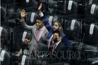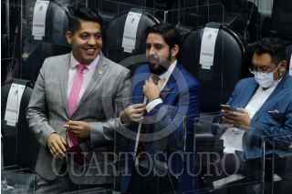CIUDAD DE MÉXICO, 09SEPTIEMBRE2021.- Emmanuel Reyes Carmona, Hamlet García Almaguer, y Favio Castellanos Polanco, diputados de Morena, presuntamente devotos de "La Luz del Mundo" durante la sesión ordinaria de la Cámara de Diputados. FOTO: MARIO JASSO/CUARTOSCURO.COM