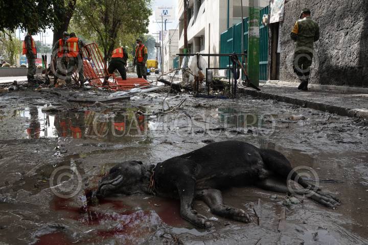 TULA DE ALLENDE, HIDALGO, 10SEPTIEMBRE2021.- De la inundación que azotó el centro de la entidad sólo quedan las marcas en las fachas de negocios y casas. Mientras, los trabajos de limpieza continúan, elementos de la SEDENA y del Instituto Mexicano del Seguro Social comenzaron con el retiro de bienes que se encontraban al interior del Hospital General de Zona Número 5, donde fallecieron 17 personas tras el fallo en el suministro de oxígeno medicinal en el área covid-19. FOTO: GALO CAÑAS/CUARTOSCURO.COM
