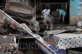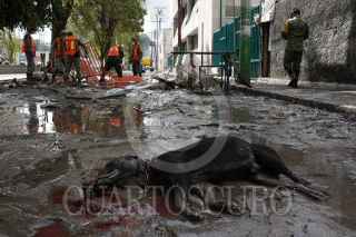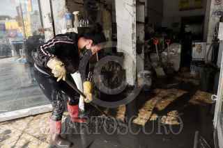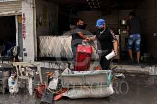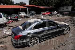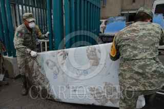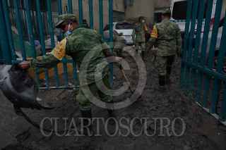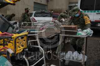TULA DE ALLENDE, HIDALGO, 10SEPTIEMBRE2021.- De la inundación que azotó el centro de la entidad sólo quedan las marcas en las fachas de negocios y casas. Mientras, los trabajos de limpieza continúan, elementos de la SEDENA y del Instituto Mexicano del Seguro Social comenzaron con el retiro de bienes que se encontraban al interior del Hospital General de Zona Número 5, donde fallecieron 17 personas tras el fallo en el suministro de oxígeno medicinal en el área covid-19. FOTO: GALO CAÑAS/CUARTOSCURO.COM