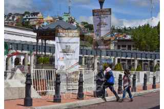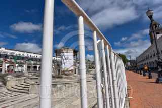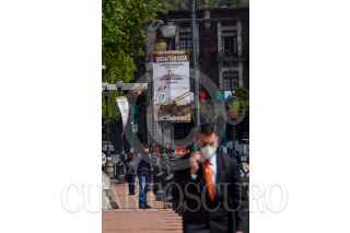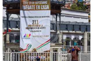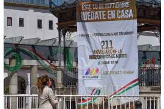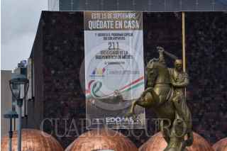 TOLUCA, ESTADO DE MÉXICO, 13SEPTIEMBRE2021.- En el centro de Toluca fueron colocadas mantas en donde invitan a la población a quedarse en casa este 15 de septiembre, y disfrutar de un programa especial como parte de los festejos del 211 Aniversario de la Independencia de México, el cual será transmitido por TV Mexiquense y así evitar las aglomeraciones y un aumento en los contagios por COVID-19. FOTO: CRISANTA ESPINOSA AGUILAR /CUARTOSCURO.COM