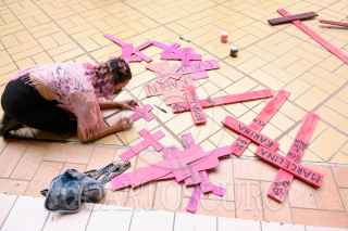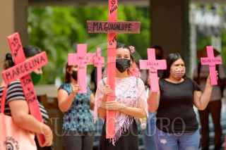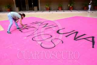 CULIACÁN, SINALOA, 15SEPTIEMBRE2021.- Mujeres activistas escogieron este 15 de septiembre, día en que se celebra el inicio de la Independencia de México, para protestar contra la violencia doméstica y contra los feminicidios registrados en Sinaloa. Priscila Salas, líder del colectivo No se metan con nuestras hijas, denunció que en los últimos 6 años se han cometido 800 asesinatos de mujeres en Sinaloa y que el nivel de impunidad sobre esos casos es del 97 por ciento. El grupo de mujeres Inició la protesta pintando una gran cruz rosa en todo el patio central de Palacio de Gobierno. Posteriormente realizaron un pase de lista de los nombres de las 36 mujeres que han sido asesinadas en este 2021. Las mujeres después marcharon hacia palacio municipal en donde también se manifestaron. A un mes y medio de que culmine el gobierno del priista Quirino Ordaz Coppel, y pese a la alerta de violencia de género que fue aceptada por esa administración, la violencia feminicida se recrudeció en los últimos años. FOTO: JUAN CARLOS CRUZ/CUARTOSCURO.COM