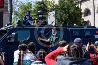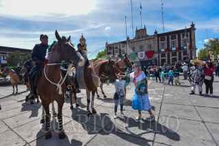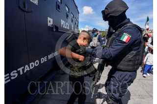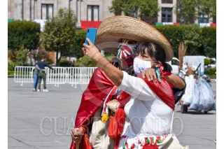 TOLUCA, ESTADO DE MÉXICO, 15SEPTIEMBRE2021.- Al concluir el breve desfile de la Policía Estatal en la Plaza de los Mártires como parte de la celebración de los 211 años del Inicio de Independencia familias que se encontraban en el centro de Toluca aprovecharon para sacarse la fotografía del recuerdo con los elementos policiacos. FOTO: CRISANTA ESPINOSA AGUILAR /CUARTOSCURO.COM
