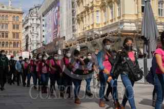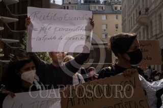 VIENA, AUSTRIA, 17SEPTIEMBRE2021.- Compañeros de solidaridad internacional realizaron una manifestación acompañados por parte de la FuerzaAérea Zapatista frente al edificio de la embajada de México en Viena, exigiendo la presentación con vida de los dos compañeros Antonio Sanchez Juarez y Sebastián Nuñez Perez, integrantes de la junta de Buen Gobierno del Caracol 10, quienes fueron secuestrados presuntamente por la Orcao, durante la manifestación se exige al gobierno estatal chiapaneco encabezado por Rutilio Escandón, acusado también de ser el líder de grupos paramilitares que violentan a las comunidades zapatistas y no zapatistas. FOTO: ISABEL MATEOS /CUARTOSCURO.COM