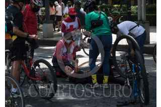 CIUDAD DE MÉXICO, 19SEPTIEMBRE2021.- Una mujer cayó de su bicicleta cuando rodaba sobre avenida Reforma lesionándose la cabeza, personal de la Cruz Roja le brindó atención médica en el lugar. FOTO: MOISÉS PABLO/CUARTOSCURO.COM
