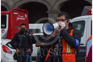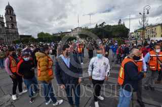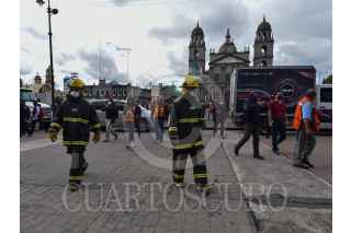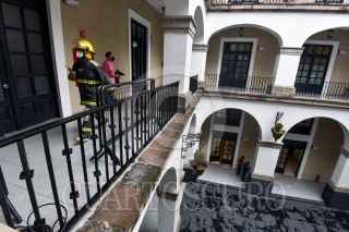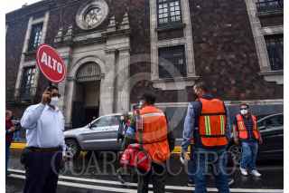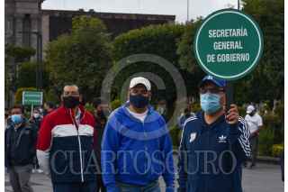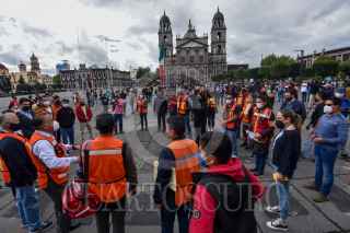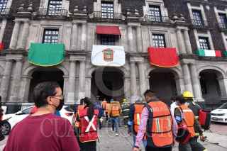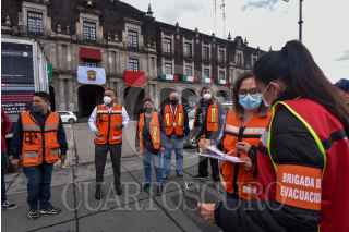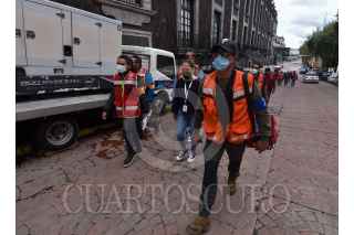 TOLUCA, ESTADO DE MÉXICO, 19SEPTIEMBRE2021.- Como parte del Macrosimulacro 2021 a las 11:30 de la mañana de este domingo sonó la alerta sísmica en la capital mexiquense como parte de un sismo hipotético de magnitud 7.2 con epicentro en Acatlán Puebla, personal de gobierno que se encontraba laborando en ese momento concentrándose en la Plaza de los Mártires, mientras las cuadrillas de Protección Civil realizaban la supervisión del inmueble. Esto en el aniversario de los sismos de 1985 y 2017. FOTO: CRISANTA ESPINOSA AGUILAR /CUARTOSCURO.COM