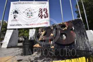 CHILPANCINGO, GUERRERO, 19SEPTIEMBRE2021. - La mañana de este domingo, el antimonumento a los 43 se encontró bañado en aceite quemado, tras la identificación de los cuerpos que quedaron prensados e incinerados cuando fueron impactados por un autobús en el que viajaban normalistas de Ayotzinapa. El combustible fue vertido sobre el antimonumento, por lo que quedó cubierto por una capa obscura, casi negra, y el resto se sigue dispersando hacia la banqueta y la avenida Lázaro Cárdenas. FOTO: DASAEEV TELLÉZ /CUARTOSCURO.COM