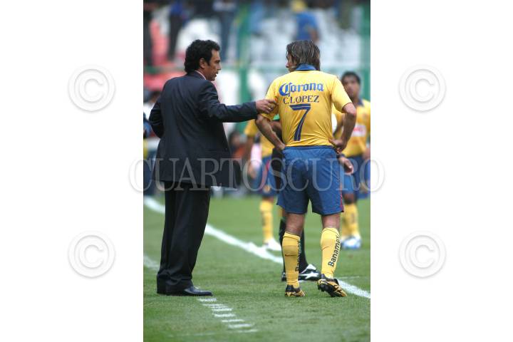 MÉXICO, D.F. 08OCTUBRE2006.- Claudio "El piojo" López, festeja el gol anotado para su equipo junto con el jugador Matías Vuoso en el encuantro disputado en el Estadio Azteca entre las águilas del América y los hidrorayos del Necaxa, donde el conjunto local se impuso dos goles a cero al Necaxa en la continuación de la jornada 12 del Torneo de Apertura 2006. FOTO: IVÁN STEPHENS/CUARTOSCURO.COM