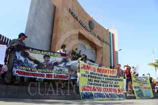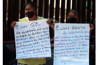 CUERNAVACA MORELOS, 22SEPTIEMBRE2021. Ejidatarios de Ayala e Integrantes del Frente en Defensa de la Tierra y el Agua se manifestaron fuera de los juzgados federales en esta capital para exigir que en la audiencia programada para este miércoles se ordene la suspensión de las pruebas de funcionamiento de la termoeléctrica de Huexca, porque a pesar que hay más de 20 amparos vigentes, la Comisión Federal de Electricidad los ha omitido y ha tomado agua que es de los ejidos. FOTO: MARGARITO PÉREZ RETANA / CUARTOSCURO.COM
