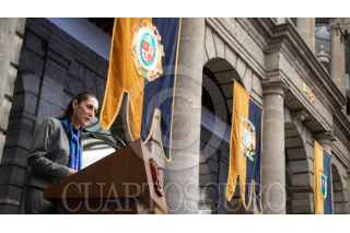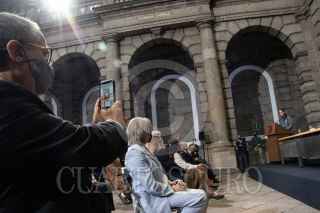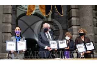 CIUDAD DE MÉXICO, 22SEPTIEMBRE2021.- Claudia Sheinbaum, Jefa de Gobierno; Enrique Graue Wiechers, rector de la UNAM; Rocío Barcena, directora general del Servicio Postal Mexicano, y Rosaura Ruiz Gutiérrez, secretaria de Educación, Ciencia, Tecnología e Innovación, encabezaron la cancelación de la Estampilla Postal de 100 años del Escudo y Lema Universitario, que se realizo en el Palacio de Minería; en el Centro Histórico de la Ciudad. FOTO: CUARTOSCURO.COM