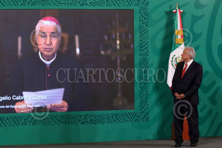 CIUDAD DE MÉXICO, 27SEPTIEMBRE2021.- Andrés Manuel López Obrador, Presidente de México, encabezó la mañanera en Palacio Nacional, en donde presentó las actividades que llevarán a cabo por la consumación de la Independencia de México, entre las que destacan la exposición Grandeza de México que inaugurará pasado el medio día en el Museo Nacional de Antropología. También por la noche habrá un espectáculo multidisciplinario en el zócalo con la temática de las diversas etapas históricas que vivió México previo a lograr su independencia. En la misma ceremonia entregó a Roberto Ricardi, comandante de los Cariberos para la Protección del Patrimonio Cultural, la Orden Mexicana del Águila Azteca en grado de placa por su trabajo en la recuperación de piezas prehispánicas en su natal Italia. El Banco de México se sumó a esta conmemoración presentando una nueva familia de monedas con motivos prehispánicos e históricos. Ya casi al finalizar en un video Rogelio Cabrera López, arzobispo de Monterrey y presidente de la Conferencia del Episcopado Mexicano (CEM) leyó una carta del Papa Francisco en la que el Sumo Pontífice pidió perdón por los abusos de la iglesia en el proceso colonizador. Acompañaron al ejecutivo Luis Cresencio Sandoval, Alejandra Frausto, Diego Prieto, Marcelo Ebrard, y Tatiana Clouthier. FOTO: MOISÉS PABLO/CUARTOSCURO.COM