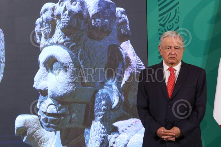 CIUDAD DE MÉXICO, 27SEPTIEMBRE2021.- Andrés Manuel López Obrador, Presidente de México, encabezó la mañanera en Palacio Nacional, en donde presentó las actividades que llevarán a cabo por la consumación de la Independencia de México, entre las que destacan la exposición Grandeza de México que inaugurará pasado el medio día en el Museo Nacional de Antropología. También por la noche habrá un espectáculo multidisciplinario en el zócalo con la temática de las diversas etapas históricas que vivió México previo a lograr su independencia. En la misma ceremonia entregó a Roberto Ricardi, comandante de los Cariberos para la Protección del Patrimonio Cultural, la Orden Mexicana del Águila Azteca en grado de placa por su trabajo en la recuperación de piezas prehispánicas en su natal Italia. El Banco de México se sumó a esta conmemoración presentando una nueva familia de monedas con motivos prehispánicos e históricos. Ya casi al finalizar en un video Rogelio Cabrera López, arzobispo de Monterrey y presidente de la Conferencia del Episcopado Mexicano (CEM) leyó una carta del Papa Francisco en la que el Sumo Pontífice pidió perdón por los abusos de la iglesia en el proceso colonizador. Acompañaron al ejecutivo Luis Cresencio Sandoval, Alejandra Frausto, Diego Prieto, Marcelo Ebrard, y Tatiana Clouthier. FOTO: MOISÉS PABLO/CUARTOSCURO.COM
