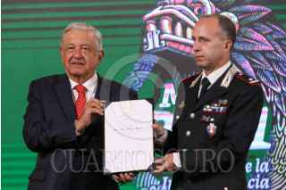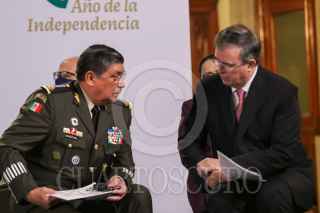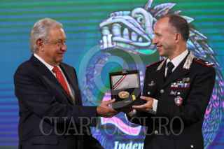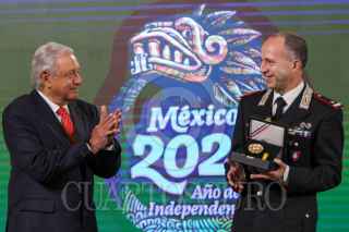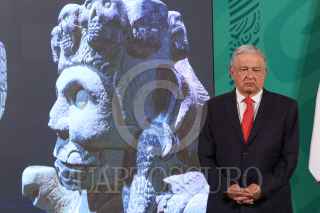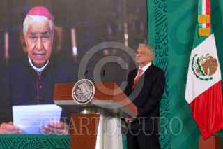 CIUDAD DE MÉXICO, 27SEPTIEMBRE2021.- Andrés Manuel López Obrador, Presidente de México, encabezó la mañanera en Palacio Nacional, en donde presentó las actividades que llevarán a cabo por la consumación de la Independencia de México, entre las que destacan la exposición Grandeza de México que inaugurará pasado el medio día en el Museo Nacional de Antropología. También por la noche habrá un espectáculo multidisciplinario en el zócalo con la temática de las diversas etapas históricas que vivió México previo a lograr su independencia. En la misma ceremonia entregó a Roberto Ricardi, comandante de los Cariberos para la Protección del Patrimonio Cultural, la Orden Mexicana del Águila Azteca en grado de placa por su trabajo en la recuperación de piezas prehispánicas en su natal Italia. El Banco de México se sumó a esta conmemoración presentando una nueva familia de monedas con motivos prehispánicos e históricos. Ya casi al finalizar en un video Rogelio Cabrera López, arzobispo de Monterrey y presidente de la Conferencia del Episcopado Mexicano (CEM) leyó una carta del Papa Francisco en la que el Sumo Pontífice pidió perdón por los abusos de la iglesia en el proceso colonizador. Acompañaron al ejecutivo Luis Cresencio Sandoval, Alejandra Frausto, Diego Prieto, Marcelo Ebrard, y Tatiana Clouthier. FOTO: MOISÉS PABLO/CUARTOSCURO.COM