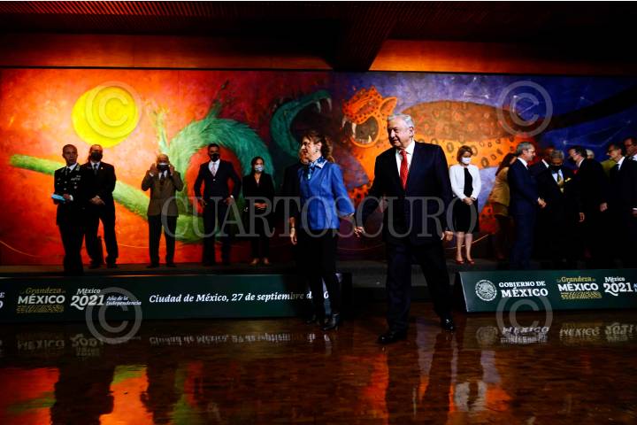 CIUDAD DE MÉXICO, 27SEPTIEMBRE2021.- Andrés Manuel López Obrador, Presidente Constitucional de los Estados Unidos Mexicanos, encabezó la Inauguración de la exposición “La Grandeza de México” en el Museo Nacional de Antropología, en el marco de los festejos por los 200 años de la consumación de la Independencia de México. Lo acompañaron José Rafael Ojeda Durán, Secretario de Marina; Diego Prieto Hernández, Director del Instituto Nacional de Antropología e Historia (INAH); Rosa Icela Rodríguez Velázquez, Secretaria de Seguridad y Protección Ciudadana; Claudia Sheimbaum, Jefa de Gobierno de la Ciudad de México; Alejandra Frausto Guerrero, Secretaria de Cultura; Gral. de Brig. Roberto Riccardi, Comandante de los Carabineros para la protección del Patrimonio Cultural de Italia; Marcelo Ebrard Casaubon, Secretario de Relaciones Exteriores; Eduardo Villegas Megías; Coordinador General de Memoria Histórica y Cultural de México del Gobierno de la República; Delfina Gómez Álvarez, secretaria de Educación Publica y Luis Cresencio Sandoval González, secretario de la Defensa Nacional. FOTO: PRESIDENCIA/CUARTOSCURO.COM