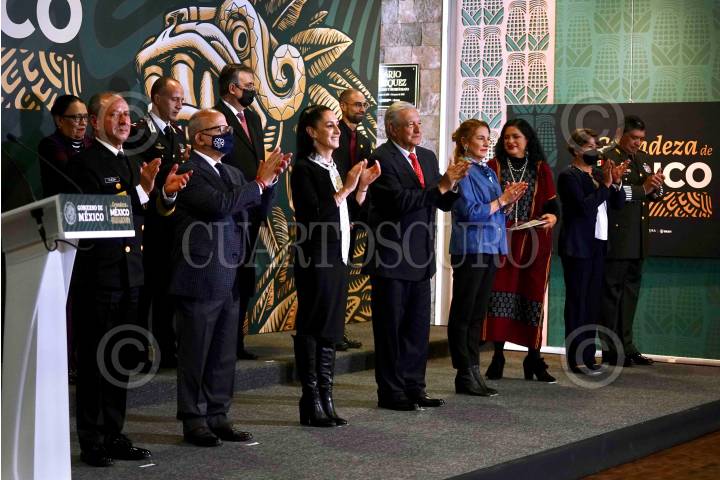 CIUDAD DE MÉXICO, 27SEPTIEMBRE2021.- Andrés Manuel López Obrador, Presidente Constitucional de los Estados Unidos Mexicanos, encabezó la Inauguración de la exposición “La Grandeza de México” en el Museo Nacional de Antropología, en el marco de los festejos por los 200 años de la consumación de la Independencia de México. Lo acompañaron José Rafael Ojeda Durán, Secretario de Marina; Diego Prieto Hernández, Director del Instituto Nacional de Antropología e Historia (INAH); Rosa Icela Rodríguez Velázquez, Secretaria de Seguridad y Protección Ciudadana; Claudia Sheimbaum, Jefa de Gobierno de la Ciudad de México; Alejandra Frausto Guerrero, Secretaria de Cultura; Gral. de Brig. Roberto Riccardi, Comandante de los Carabineros para la protección del Patrimonio Cultural de Italia; Marcelo Ebrard Casaubon, Secretario de Relaciones Exteriores; Eduardo Villegas Megías; Coordinador General de Memoria Histórica y Cultural de México del Gobierno de la República; Delfina Gómez Álvarez, secretaria de Educación Publica y Luis Cresencio Sandoval González, secretario de la Defensa Nacional. FOTO: PRESIDENCIA/CUARTOSCURO.COM