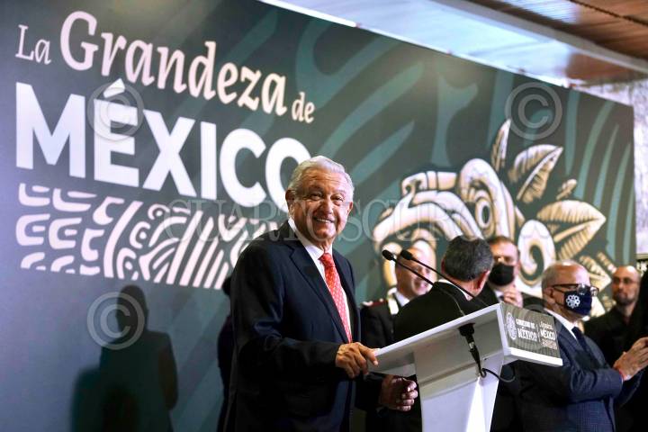 CIUDAD DE MÉXICO, 27SEPTIEMBRE2021.- Andrés Manuel López Obrador, Presidente Constitucional de los Estados Unidos Mexicanos, encabezó la Inauguración de la exposición “La Grandeza de México” en el Museo Nacional de Antropología, en el marco de los festejos por los 200 años de la consumación de la Independencia de México. Lo acompañaron José Rafael Ojeda Durán, Secretario de Marina; Diego Prieto Hernández, Director del Instituto Nacional de Antropología e Historia (INAH); Rosa Icela Rodríguez Velázquez, Secretaria de Seguridad y Protección Ciudadana; Claudia Sheimbaum, Jefa de Gobierno de la Ciudad de México; Alejandra Frausto Guerrero, Secretaria de Cultura; Gral. de Brig. Roberto Riccardi, Comandante de los Carabineros para la protección del Patrimonio Cultural de Italia; Marcelo Ebrard Casaubon, Secretario de Relaciones Exteriores; Eduardo Villegas Megías; Coordinador General de Memoria Histórica y Cultural de México del Gobierno de la República; Delfina Gómez Álvarez, secretaria de Educación Publica y Luis Cresencio Sandoval González, secretario de la Defensa Nacional. FOTO: PRESIDENCIA/CUARTOSCURO.COM