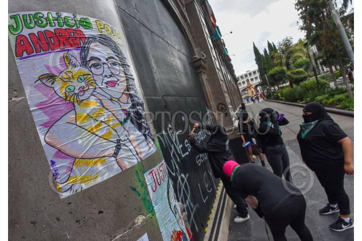 TOLUCA, ESTADO DE MÉXICO, 28SEPTIEMBRE2021.- Mujeres y diversas colectivas del Estado de México realizaron una movilización en la acción global por un aborto seguro, libre y gratuito, caminaron por diversas calles de la capital mexiquense hasta llegar a la Cámara de Diputados; momentos antes tuvieron al altercado con policías municipales que resguardaban la Catedral de Toluca, rompieron vidrios, realizaron pintas y abrieron las puertas metálicas que protegen el recinto legislativo. FOTO: CRISANTA ESPINOSA AGUILAR /CUARTOSCURO.COM