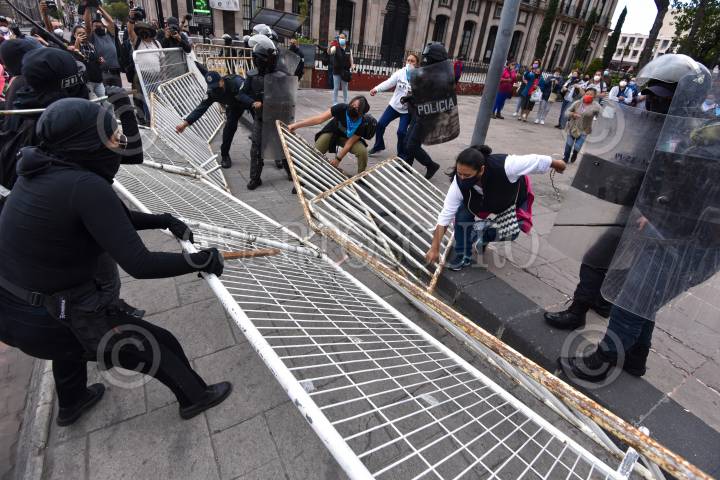 TOLUCA, ESTADO DE MÉXICO, 28SEPTIEMBRE2021.- Mujeres y diversas colectivas del Estado de México realizaron una movilización en la acción global por un aborto seguro, libre y gratuito, caminaron por diversas calles de la capital mexiquense hasta llegar a la Cámara de Diputados; momentos antes tuvieron al altercado con policías municipales que resguardaban la Catedral de Toluca, rompieron vidrios, realizaron pintas y abrieron las puertas metálicas que protegen el recinto legislativo. FOTO: CRISANTA ESPINOSA AGUILAR /CUARTOSCURO.COM