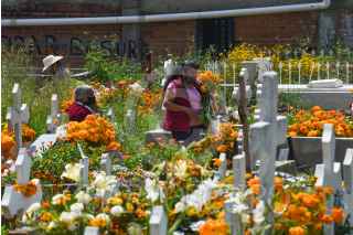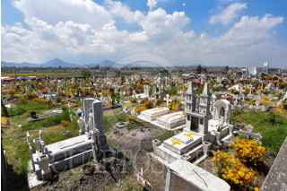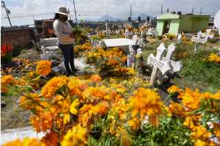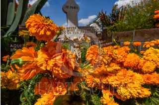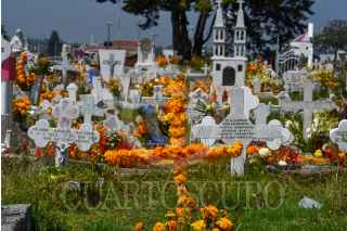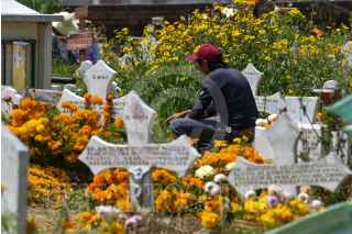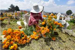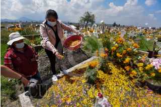 TOLUCA, ESTADO DE MÉXICO, 29SEPTIEMBRE2021.- Los panteones del norte de Toluca, zona indígena Otomí, un lugar de tradiciones en donde se visten de amarillo por la flor de cempasúchil, en honor a su santo patrono San Miguel Arcángel, los cuales no lucieron igual el año pasado ya que la mayoría permaneció cerrado ante el incremento de contagios por COVID-19; en esta ocasión uno o dos integrantes de cada familia acudieron al panteón días antes para adornar sus tumbas y recordar a sus familiares muertos, algunos ya tienen tiempo que descansan en este lugar y otros tienen algunos meses que dejaron de existir. Las personas mayores tratan de que esta tradición de la continúe y no se pierda. FOTO: CRISANTA ESPINOSA AGUILAR /CUARTOSCURO.COM