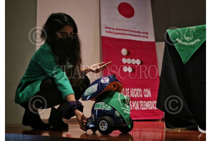 CIUDAD DE MÉXICO, 20SEPTIEMBRE2021. - Como parte de las acciones en el marco del Día de Acción Global por un Aborto Legal y Seguro, celebrado cada 28 de septiembre, el colectivo Acompañantes presento de a la robot “Raborta”, que emite dosis de medicamento (misoprostol o mifepristona), que es suministrado para provocar abortos. El objetivo del robot rAborta es entregar pastillas de mifepristona tras un aval médico desde la CDMX. Este se maneja a través de una app del celular. “El robot es manejado desde la Ciudad de México, donde el Código Penal permite tener un aborto a voluntad. Al estar la persona que entrega el medicamento no se infringe la ley. Se maneja en un contexto donde es legal”, dijo durante conferencia de prensa Jennifer González, miembro de una de las colectivas feministas. FOTO: ANDREA MURCIA/CUARTOSCURO.COM