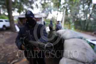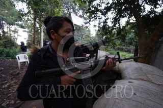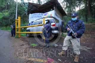 LOS REYES DE SALGADO, MICHOACÁN, 29SEPTIEMBRE2021. Vuelve la tensión en las comunidades purépechas de Cherato, Cheratillo, Oruscato y la 18 de marzo. La Guardia Nacional, en días pasados, llegaron al lugar conocido como “El Corral” a quitar las mantas colocadas dentro del territorio de la comunidad, que denuncian la falta de seguridad. Actualmente la zona esta al borde de un colapso económico y social sin precedente por la violencia generada por los carteles del narcotráfico, los residentes de estas comunidades viven un ambiente de terror constante. Hace seis meses el municipio se convirtió en zona de guerra entre pistoleros del Cártel Jalisco Nueva Generación (CJNG), contra las fuerzas armadas de Nicolás Sierra Santana "el Gordo", líder del cártel de Los Viagras. En la imagen hombres y mujeres de la ronda comunitaria vigilan los accesos a sus comunidades ante la violencia generada por los grupos criminales. FOTO: JUAN JOSÉ ESTRADA SERAFÍN /CUARTOSCURO.COM