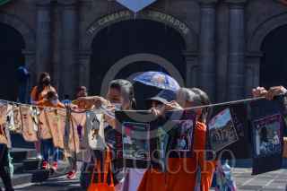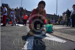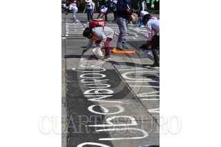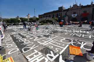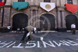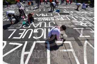 TOLUCA, ESTADO DE MÉXICO, 30SEPTIEMBRE2021.- Integrantes de Haz Valer mi Libertad y familiares de personas presas presuntamente inocentes realizaron la pinta de nombres de sus familiares presos, con la actividad llamada “Remarcando la libertad de los nadies” en frente de la Cámara de Diputados y una parte de la Plaza de los Mártires, para exigir sea integrada la Comisión Especial de Amnistía en la LXI Legislatura local, la cual ha sido retrasada ante la falta de acuerdo entre los diputados para para integrar las comisiones legislativas, y así puedan ser analizados los casos que presentan fallas judiciales y puedan ser liberados. FOTO: CRISANTA ESPINOSA AGUILAR /CUARTOSCURO.COM