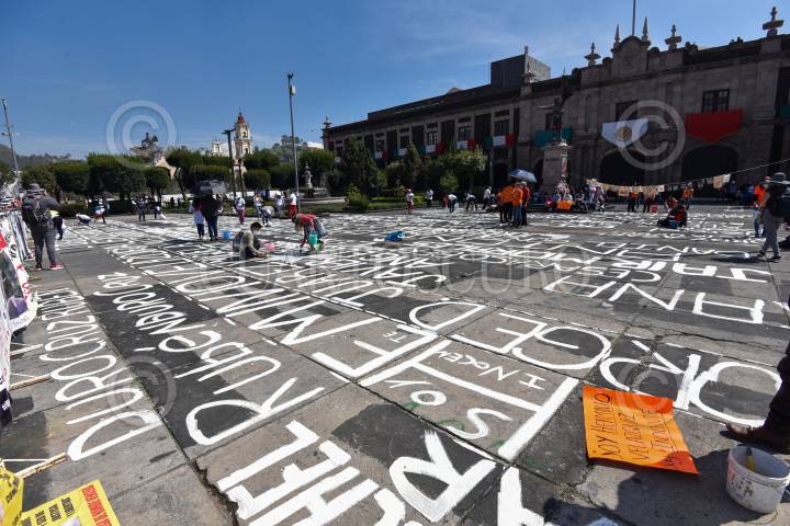 TOLUCA, ESTADO DE MÉXICO, 30SEPTIEMBRE2021.- Integrantes de Haz Valer mi Libertad y familiares de personas presas presuntamente inocentes realizaron la pinta de nombres de sus familiares presos, con la actividad llamada “Remarcando la libertad de los nadies” en frente de la Cámara de Diputados y una parte de la Plaza de los Mártires, para exigir sea integrada la Comisión Especial de Amnistía en la LXI Legislatura local, la cual ha sido retrasada ante la falta de acuerdo entre los diputados para para integrar las comisiones legislativas, y así puedan ser analizados los casos que presentan fallas judiciales y puedan ser liberados. FOTO: CRISANTA ESPINOSA AGUILAR /CUARTOSCURO.COM