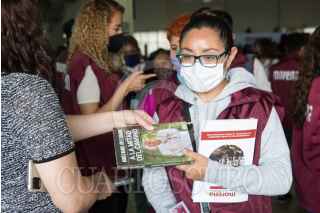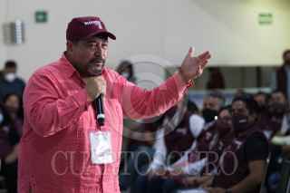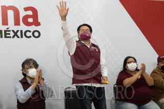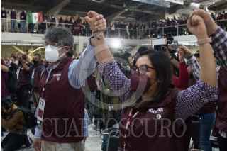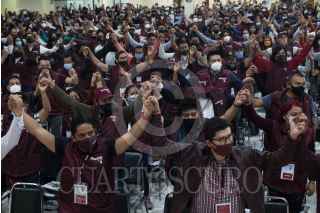 CIUDAD DE MÉXICO, 03OCTUBRE2021.- Tomás Pliego Calvo, dirigente de Morena en la Ciudad de México; Mario Delgado, dirigente Morena, Citlalli Hernández, secretaria general de Morena, y José Alejandro Peña Villa, delegado especial para la formación de Comités Estatales de Morena, encabezaron la toma de protesta de los "Defensores de la 4T", en el salón Ícaro, en la alcaldía Miguel Hidalgo. Al finalizar el encuentro a los defensores se les entregó el libro "A la mitad del camino" del Presidente Andrés Manuel López Obrador. FOTO: MOISÉS PABLO/CUARTOSCURO.COM