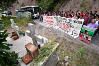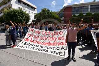 CHILPANCINGO, GUERRERO, 04OCTUBRE2021.- Estudiantes de la Escuela Normal Rural 'Raúl Isidro Burgos' de Ayotzinapa, junto con miembros del colectivo 'Los Olvidados de Ayotzinapa', realizaron un mitin político en Chilpancingo y posteriormente dejaron una ofrenda floral en el viejo Libramiento a Tixtla. Esto, para conmemorar el quinto aniversario luctuoso del asesinato de sus compañeros Filemón Tacuba y Jonathan Morales, quienes perdieran la vida durante un supuesto asalto a una unidad del transporte público de ruta Chilpancingo-Tixtla. Durante el mitin, reprocharon que hasta el momento las autoridades no hayan logrado esclarecer este crimen, a pesar de que algunos testigos han declarado que el asalto fue solo un pretexto para asesinar a sus compañeros. Ya que, en las declaraciones de los mismos testigos, se puntualiza que los supuestos asaltantes, solo dispararon a los normalistas. FOTO: DASSAEV TÉLLEZ ADAME/CUARTOSCURO.COM