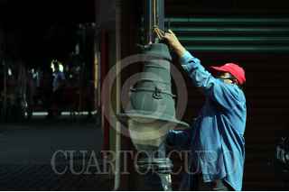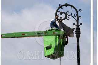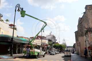 CUERNAVACA, MORELOS, 05OCTUBRE2021. Unos trabajadores del ayuntamiento de la capital dan mantenimiento a unas lámparas que están ubicadas en la calle Hidalgo. FOTO: MARGARITO PÉREZ RETANA / CUARTOSCURO.COM