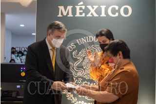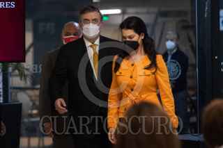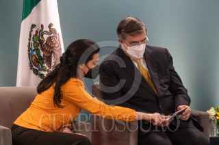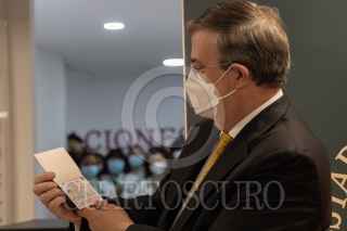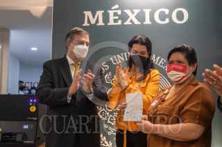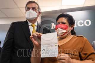 CIUDAD DE MÉXICO, 05OCTUBRE2021.- Marcelo Ebrard Casaubon, secretario de Relaciones Exteriores, y su esposa Rosalinda Bueso, asistieron a la ceremonia en donde se emitió el nuevo pasaporte electrónico, el cual contará con la información de los padres, en el caso de los menores de edad. El primer ejemplar fue emitido a una trabajadora de la SRE, en las Oficinas de Pasaportes "Coyoacán", ubicada en la Plaza Comercial Punto MAQ, en la alcaldía Coyoacán. FOTO: MOISÉS PABLO/CUARTOSCURO.COM