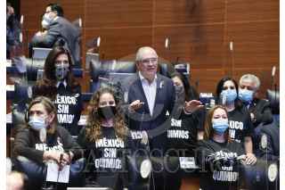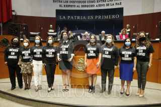 CIUDAD DE MÉXICO, 05OCTUBRE2021.- Las senadoras panistas Xóchitl Gálvez Ruiz, Kenia López Rabadán, Estrella Rojas Loreto, y Gloria Elizabeth Núñez Sánchez, acompañadas de su coordinador Julen Rementería, se manifestaron por la supuesta falta de tratamientos de quimioterapias para niños. Los parlamentarios portaron una camisa negra con la leyenda "México sin Quimios". FOTO: CUARTOSCURO.COM