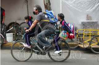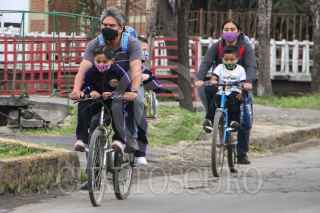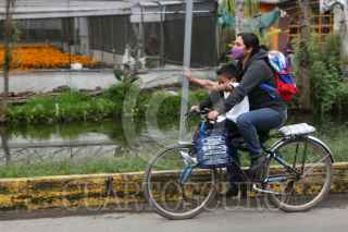 CIUDAD DE MÉXICO, 06OCTUBRE2021.- Una familia completa rueda en sus bicicletas, con los padres al volante y los niños de copilotos, después de un día de escuela, esto en calles de la alcaldía Xochimilco. FOTO: ROGELIO MORALES /CUARTOSCURO.COM