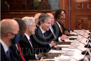 CIUDAD DE MÉXICO, 08OCTUBRE2021.- Andrés Manuel López Obrador, presidente Constitucional de los Estados Unidos Mexicanos en Reunión México-Estados Unidos de America. Lo acompañan Adán Augusto López Hernández, secretario de Gobernación; Marcelo Ebrard Casaubon, secretario de Relaciones Exteriores; Luis Cresencio Sandoval González, secretario de la Defensa Nacional; José Rafael Ojeda Durán, secretario de Marina; Rosa Icela Rodríguez Velázquez, secretaria de Seguridad y Protección Ciudadana; Rogelio Ramírez de la O, secretario de Hacienda y Crédito Público; Esteban Moctezuma Barragán, embajador de México en Estados Unidos; Francisco Garduño Yáñez, titular del Instituto Nacional de Migración (INM) y Roberto Velasco Álvarez, titular de la Unidad para América del Norte de la SRE. Por parte del gobierno de Estados Unidos: Antony Blinken, secretario de Estado; Merrick B. Garland, fiscal general; Alejandro Mayorkas, secretario de Seguridad Nacional; Bruce Swartz, fiscal general adjunto y consejero de Asuntos Internacionales del Departamento de Justicia; Wally Adeyemo, secretario adjunto de la Tesorería; Brian A. Nichols, subsecretario de Estado para Asuntos del Hemisferio Occidental; Juan Sebastián González, consejero especial del presidente y director principal para el Hemisferio Occidental del Consejo Nacional de Seguridad; Serena Hoy, subsecretaria de Asuntos Internacionales del Departamento de Seguridad Nacional y Brian Naranjo, tomador de notas de la Embajada de Estados Unidos en México. Foto: PRESIDENCIA/CUARTOSCURO.COM