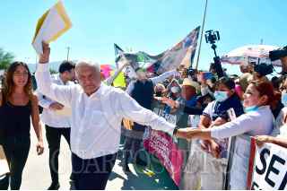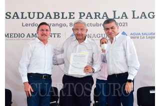 LERDO, DURANGO, 08OCTUBRE2021.- Andrés Manuel López Obrador, presidente de México, encabezó el anunció de inicio del proyecto “Agua Saludable para La Laguna” en el Centro Regional de Atención a Emergencias de Conagua en Lerdo, Durango. El mandatario estuvo acompañado por: Alejandro Rodríguez Belmonte, Presidente Municipal de Tlahualilo, Durango; Germán Arturo Martínez Santoyo, Director General de la Comisión Nacional del Agua; Nadia Jaramillo Rodríguez, Presidenta Municipal de Viesca, Coahuila de Zaragoza; José Rosas Aispuro Torres, gobernador de Durango; Jorge Zermeño Infante, Presidente Municipal de Torreón, Coahuila de Zaragoza; Alma Marina Vitela Rodríguez, Presidenta Municipal de Gómez Palacio, Durango; Miguel Ángel Riquelme Solís, Gobernador de Coahuila de Zaragoza; Patricia Grado Falcón, Presidenta Municipal de San Pedro, Coahuila de Zaragoza; Eduardo Tricio Haro, Presidente de Grupo Lala; Marisol Peña Rodríguez, Presidenta Municipal de Mapimí, Durango; Horacio Piña Ávila, Presidente Municipal de Matamoros, Coahuila de Zaragoza y Homero Martínez Cabrera, Presidente Municipal de Lerdo, Durango. El proyecto se inauguraría en 2023 y tiene como objetivo atender la contaminación con arsénico que se presenta en los mantos acuíferos de la región. Foto: PRESIDENCIA/CUARTOSCURO.COM