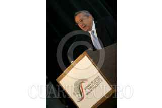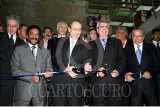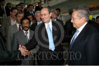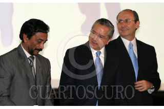 MÈXICO D.F. 13OCTUBRE2006.- Victor Flores, Secretario del Congreso del Trabajo, Francisco Javier Salazar, secretario del Trabajo y Sergio García de Alba Zepeda Secretario de Economia, durante la inauguración de la exposición "Conección al Mundo Laboral" en la Biblioteca Central Vasconcelos. FOTO: GUILLERMO PEREA /CUARTOSCURO.COM