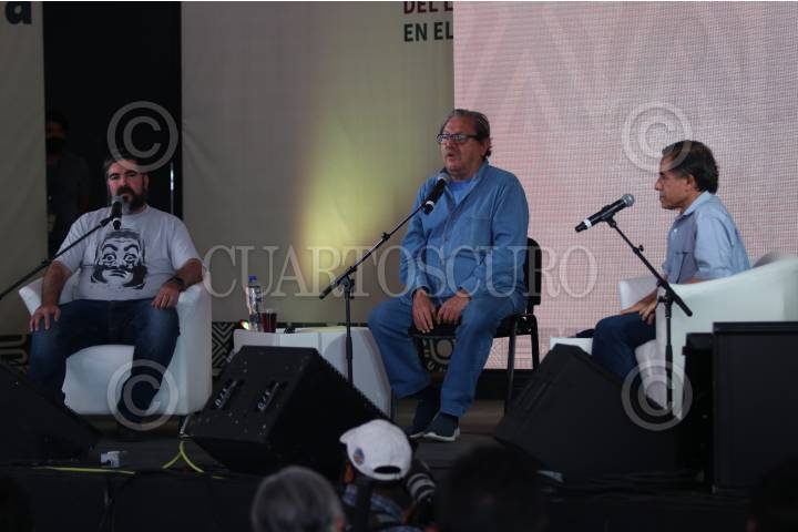 CIUDAD DE MÉXICO, 10OCTUBRE2021.- Paco Ignacio Taibo II, director del fondo de Cultura Económica, Felipe Ávila y Juan Carlos Ruiz, durante la charla "El cura Hidalgo" que se llevo a cabo en el foro Antonio Helguera como parte del ciclo de charlas y actividades de la XXI Feria Internacional del Libro en el Zócalo. FOTO: ANDREA MURCIA /CUARTOSCURO.COM
