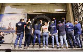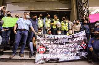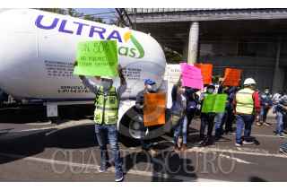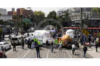 CIUDAD DE MÉXICO, 11OCTUBRE2021.- Trabajadores del gremio gasero convocaron a un paro nacional y bloquearon el cruce de Insurgentes y Eje 5 Sur al exterior de la Secretaria de Energía, provocando un caos víal en esta dos principales arterias de la Capital. FOTO: CRISTIÁN HERNÁNDEZ/CUARTOSCURO.COM