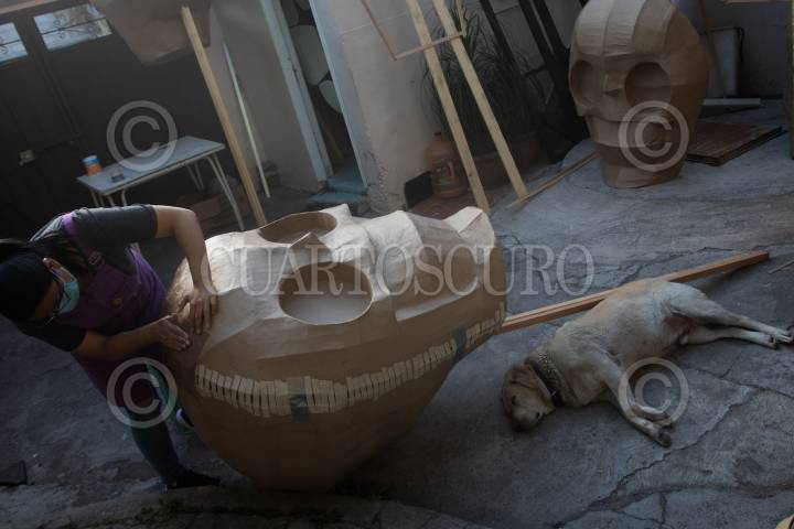 CIUDAD DE MÉXICO, 16OCTUBRE2021.- El colectivo “Jaencartonería” encabezado por Raymundo Medina Jaen y sus familiares Roy, Mariana, Dan y Reyna, se dedican desde el año 2011 a elaborar Calaveras Monumentales en la colonia Santa Cecilia, alcaldía Tláhuac. Raymundo Medina cuenta que la idea surgió porque el primer año colocó una calavera pequeña afuera de su casa simulando que salía de la banqueta, al notar que a los vecinos y la gente que transitaba les gustó, el colectivo comenzó a realizar calaveras y catrinas más grandes interviniendo las calles y las casas de los vecinos cada año. En el año 2019, las Calaveras Monumentales se viralizaron en redes sociales porque se compartió una fotografía en la que informaban que los vecinos habían colocado calaveras en baches de las calles de Francisco Santiago Borra y Enrique Lombardo, la gente se asombraba por la magnitud de las calaveras en medio de estas calles y ofrendas realizadas afuera de las casas de los vecinos. “Mantener la tradición de Día de Muertos, hacer algo diferente desde nuestra trinchera y mantener las calles y el entorno es el objetivo del colectivo al realizar las calaveras monumentales cada año”, expresa Raymundo. Este año el perro nativo “Xoloitzcuintle” será el personaje principal en la intervención de las calles, el cual representa el perro que acompaña a las almas a cruzar hacia el Mictlán o inframundo. Las calaveras monumentales se podrán apreciar a finales del mes de octubre y durante la festividad del Día de Muertos. FOTO: GRACIELA LÓPEZ /CUARTOSCURO.COM