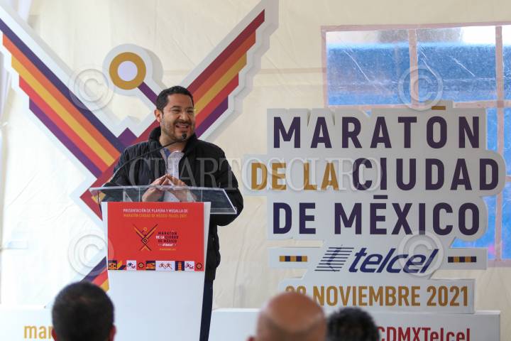 CIUDAD DE MÉXICO, 17OCTUBRE2021.- Con la presencia de Martí Batres, secretario de Gobierno capitalino; Javier Hidalgo, director del Indeporte; Sandra Cuevas, alcaldesa de Cuauhtémoc; y de algunos maratonistas como: Benjamín Paredes e Ivonne Reyes, se presentó la playera que utilizarán los corredores en la edición XXXVIII del Maratón de la Ciudad de México Telcel 2021, además se anunció que la medalla que se les entregará será alusiva al Monumento a la Revolución, lugar en donde se realizó el evento. Este evento será uno de los primeros encuentros masivos que organiza la ciudad tras casi dos años de pandemia. FOTO: MOISÉS PABLO/CUARTOSCURO.COM