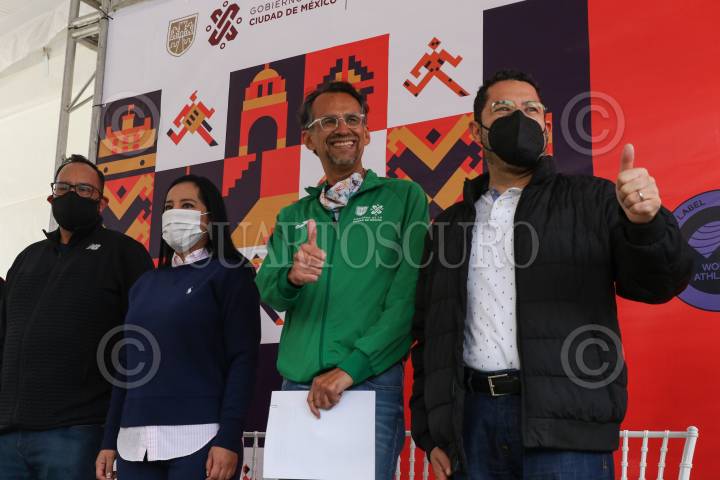 CIUDAD DE MÉXICO, 17OCTUBRE2021.- Con la presencia de Martí Batres, secretario de Gobierno capitalino; Javier Hidalgo, director del Indeporte; Sandra Cuevas, alcaldesa de Cuauhtémoc; y de algunos maratonistas como: Benjamín Paredes e Ivonne Reyes, se presentó la playera que utilizarán los corredores en la edición XXXVIII del Maratón de la Ciudad de México Telcel 2021, además se anunció que la medalla que se les entregará será alusiva al Monumento a la Revolución, lugar en donde se realizó el evento. Este evento será uno de los primeros encuentros masivos que organiza la ciudad tras casi dos años de pandemia. FOTO: MOISÉS PABLO/CUARTOSCURO.COM