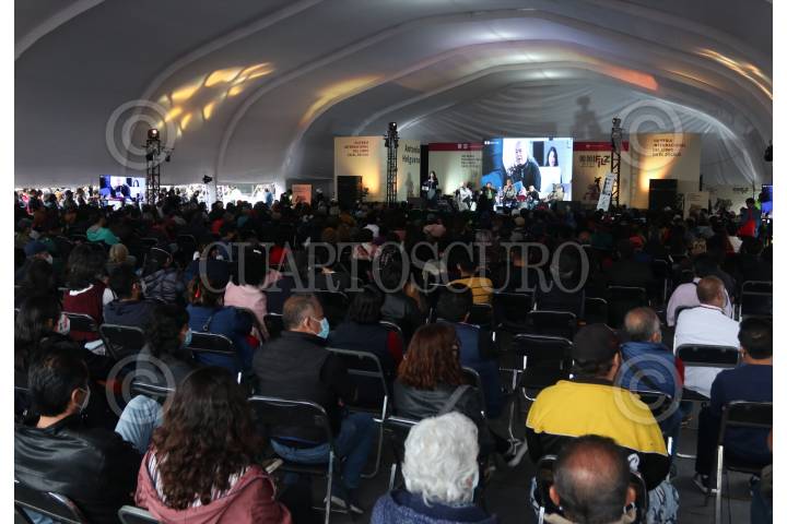 CIUDAD DE MÉXICO, 17OCTUBRE2021.- Paco Ignacio Taibo II, director del Fondo de Cultura Económica, Citlali Hernández, senadora del grupo parlamentario Morena, Enrique Dussel, Armando Bartra, Elvira Concheiro y Pedro Miguel durante la charla “La nueva y la vieja izquierda” como parte de las acrividades de la Feria Internacional del Libro en el Zócalo. FOTO: ANDREA MURCIA /CUARTOSCURO.COM