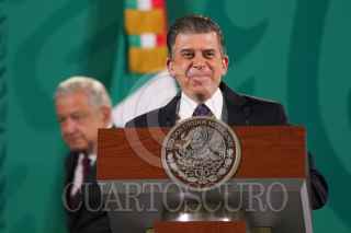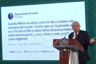 CIUDAD DE MÉXICO, 18OCTUBRE2021.- Andrés Manuel López Obrador, Presidente de México, encabezó la conferencia mañanera en Palacio Nacional, en la cual habló sobre figuras políticas como el ex Presidente, Ernesto Zedillo, y el ex candidato presidencial, Diego Fernández de Cevallos. Lo acompañaron Ricardo Sheffield Padilla, director de Profeco, que presentó el ¿Quién es quién? en las gasolinas y gas LP, y Román Meyer Falcón, titular de la Sedatu, el mostró varias obras de mejoramiento urbano que se han hecho en ciudades, como en Tijuana y Ecatepec para beneficio de la sociedad. FOTO: MOISÉS PABLO/CUARTOSCURO.COM