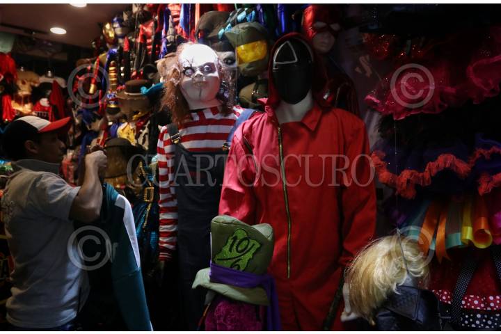 CIUDAD DE MÉXICO, 18OCTUBRE2021. - Con el regreso al Semáforo verde epidemiológico en la Ciudad, decenas de familias capitalinas aprovechan la cercania del día de muertos para comprar disfraces en el mercado Sonora. Según comerciantes el más vendido ha sido el del Juego de Calamar, serie recién estrenada en plataforma de series y peliculas. FOTO: ANDREA MURCIA /CUARTOSCURO.COM