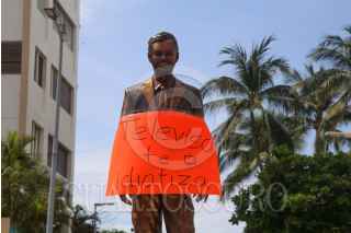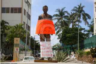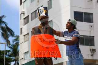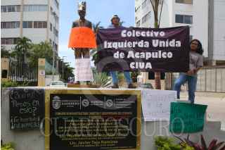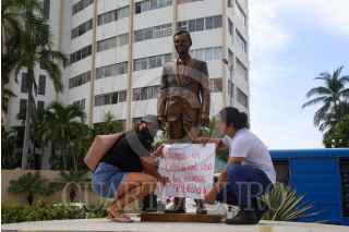 ACAPULCO, GU8ERRERO, 19OCTUBRE2021.- Integrantes del Colectivo Izquierda Unida de Acapulco protestaron en la recién inaugurada escultura del actor Eugenio Derbez, ubicada en el fraccionamiento Club Deportivo de Acapulco. Los integrantes del colectivo denunciaron el derroche de recursos por parte de la pasada administración del ex gobernador Héctor Astudillo quién pagó 300 mil pesos por la escultura, y por no tomar en cuenta a verdaderos héroes y heroínas del puerto. FOTO: CARLOS ALBERTO CARBAJAL/CUARTOSCURO.COM