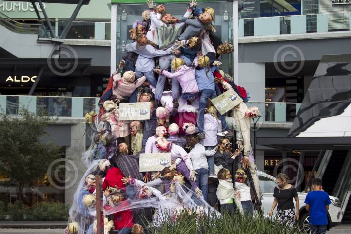 SAN PEDRO, GARZA GARCÍA, NUEVO LEÓN, 22OCTUBRE2021.- Decenas de "zombies" de trapo y de tamaño real fueron colocados en un centro comercial del sur de la ciudad como parte de la celebración de Halloween. FOTO: GABRIELA PÉREZ MONTIEL / CUARTOSCURO.COM