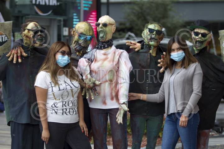 SAN PEDRO, GARZA GARCÍA, NUEVO LEÓN, 22OCTUBRE2021.- Decenas de "zombies" de trapo y de tamaño real fueron colocados en un centro comercial del sur de la ciudad como parte de la celebración de Halloween. FOTO: GABRIELA PÉREZ MONTIEL / CUARTOSCURO.COM