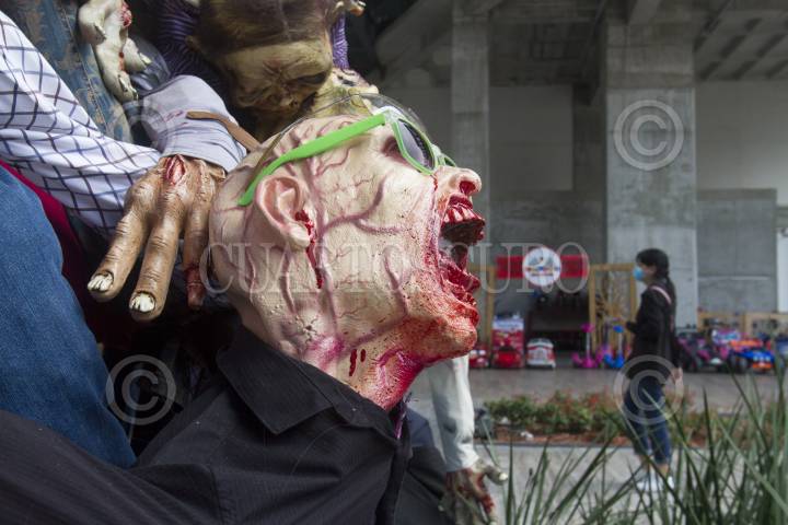 SAN PEDRO, GARZA GARCÍA, NUEVO LEÓN, 22OCTUBRE2021.- Decenas de "zombies" de trapo y de tamaño real fueron colocados en un centro comercial del sur de la ciudad como parte de la celebración de Halloween. FOTO: GABRIELA PÉREZ MONTIEL / CUARTOSCURO.COM