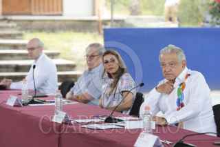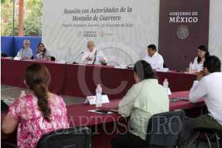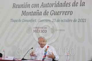 TLAPA DE COMONFORT, 23OCTUBRE2021.- Andrés Manuel López Obrador, presidente de México Mexicanos presidió la Reunión con autoridades de La Montaña de Guerrero en el Instituto Tecnológico Superior de La Montaña, Tlapa de Comonfort, Guerrero. Lo acompañan Carlos Torres Rosas, Coordinador General de Programas para el Bienestar; Jorge Alcocer Varela, Secretario de Salud; Evelyn Cecia Salgado Pineda, Gobernadora Constitucional del Estado de Guerrero; Javier May Rodriìguez, Secretario de Bienestar; Areli Ceroìn Trejo, Directora General de Suelos y Agua, y Coordinadora del Programa de Fertilizantes; Ariadna Montiel Reyes, Subsecretaria de Bienestar; Adelfo Regino Montes, Director General del Instituto Nacional de los Pueblos Indiìgenas; Victoria Rodriìguez Ceja, Subsecretaria de Egresos de la Secretariìa de Hacienda y Creìdito Puìblico; Jorge NunÞo Lara, Subsecretario de Infraestructura de la Secretariìa de Comunicaciones y Transportes; Abraham Vaìzquez Piceno, Coordinador Nacional del Programa de Becas para el Bienestar “Benito Juaìrez”; Juan Antonio Ferrer Aguilar, Director General del Instituto de Salud para el Bienestar; Pamela Loìpez Ruiz, Directora General del Programa “La Escuela es Nuestra”; Gilberto Solano Arreaga, Presidente Municipal de Tlapa de Comonfort; Aurelio Meìndez Rosales, Presidente Municipal de Huamuxtitlaìn; Rosembert Ponciano Venegas, Presidente Municipal de Xochihuehuetlaìn; Nelson Garciìa Morales, Presidente Municipal de Alpoyeca; Hazael Aburto Ortega, Presidente Municipal de Cualac; Miguel Reyes Patroìn, Presidente Municipal de Olinalaì; Eleuterio Reyes Calleja, Presidente Municipal de Copanatoyac; Selene Sotelo Maldonado, Presidenta Municipal de Xalpatlaìhuac y Joaquiìn Rosendo Luciano, Presidente Municipal de Zapotitlaìn Tablas. FOTO: PRESIDENCIA/CUARTOSCURO.COM