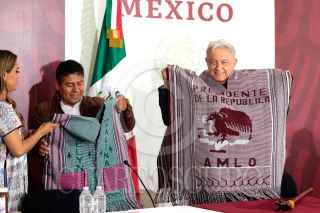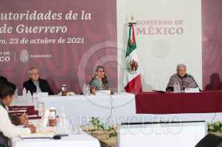 MALINALTEPEC, GUERRERO, 23OCTUBRE2021.- Andrés Manuel López Obrador, presidente de México, presidió la Reunión con autoridades de La Montaña de Guerrero en la sede Malinaltepec de la Universidad Intercultural de Guerrero. Acompañado de: Jorge Alcocer Varela, Secretario de Salud; Evelyn Cecia Salgado Pineda, Gobernadora de Guerrero; Javier May Rodríguez, Secretario de Bienestar; Adelfo Regino Montes, Director General del Instituto Nacional de los Pueblos Indígenas; Ariadna Montiel Reyes, Subsecretaria de Bienestar; Victoria Rodríguez Ceja, Subsecretaria de Egresos de la Secretaria de Hacienda y Crédito Público; Carlos Torres Rosas, Coordinador General de Programas Integrales para el Bienestar; Abraham Vázquez Piceno, Coordinador Nacional del Programa de Becas para el Bienestar “Benito Juárez”; Pamela López Ruiz, Directora General del Programa “La Escuela es Nuestra”; Areli Cerón Trejo, Directora General de Suelos y Agua y Coordinadora del Programa de Fertilizantes; Acasio Flores Guerrero, Presidente municipal de Malinaltepec; Romoaldo Díaz Rosas, Presidente municipal de Acatepec; Amado Basurto Gálvez, Presidente municipal de Tlacoapa y Camilo Cano Guzmán, Presidente municipal de Atlamajalcingo del Monte. FOTO: PRESIDENCIA/CUARTOSCURO.COM