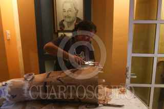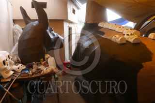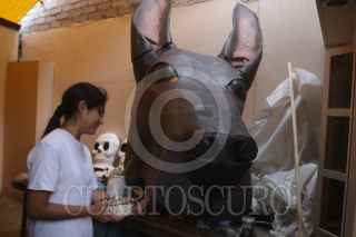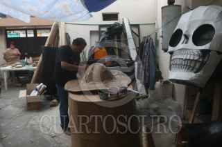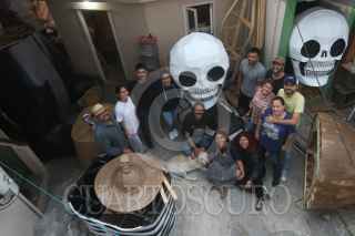 CIUDAD DE MÉXICO, 24OCTUBRE2021.- El colectivo Jaen Cartonería integrado por la familia Medina Jaen continúa realizando las Calaveras Monumentales y el personaje "Mictli", un Xoloitzcuintle Monumental que representa el perro que acompaña a las almas a cruzar hacia el Mictlán o inframundo. En el proceso se encuentran pintando las figuras monumentales y terminando de empapelar. La familia informa quese sienten nerviosos y orgullosos a pocos días de su inauguración en la colonia Santa Cecilia. La instalación será el próximo 30 de octubre. FOTO: GRACIELA LÓPEZ /CUARTOSCURO.COM